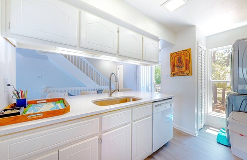 Back at Helios #D, cozy up on the living room's comfortable sofa and tune into your favorite TV show or movie. When you aren't enjoying the island's culinary scene, utilize the well-stocked kitchen to prepare your favorite meals. A stackable washer/dryer is available off the kitchen.