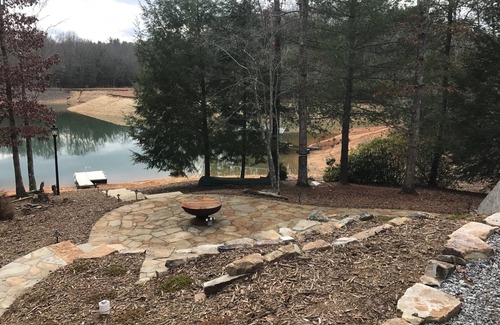 Large back porch overlooking the lake with rocking chairs and outside dining. Firepit with plenty of seating for those peaceful nights and amazing star gazing.