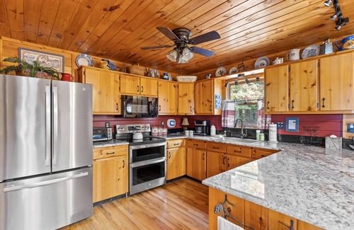 Peaks and Pines is a warm, Americana-themed retreat where rustic charm meets modern comfort. Wake up to breathtaking mountain views, cook up memories in the spacious, fully equipped kitchen, and gather for outdoor dining surrounded by nature. Unwind in the bubbling hot tub, share stories by the crackling fire pit, or simply relax under a blanket of stars. When adventure calls, downtown Blue Ridge is just a short drive away—offering shops, dining, and endless mountain fun.