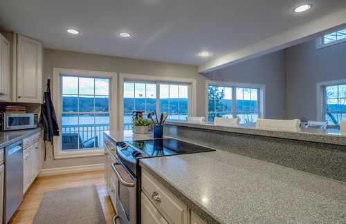 On the main floor is an open living space with large kitchen, dining area and Living room. The Kitchen is stocked with cookware and dinnerware and has a large island for additional dining. The Living room has comfortable seating, a tv, and patio doors out on the small side patio where the gas grill is located (the interior fireplace in the living room is not in able to be used by guests). From the dining area, there are large windows looking out over the lake, making it easy to dine while enjoying the views of the water. The patio doors from the dining area go out onto a small balcony where you can enjoy a few moments of quiet in the rocking chairs.