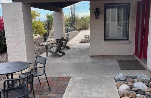Enjoy mountain views from a comfortable outdoor area, ideal for coffee at sunrise or unwinding at sunset. Large Community Pool, Hot-tub, Pickle-ball and Tennis one block from the property. Several Hiking trails within 5 minutes including Sabino Canyon. or just out your door on the hills and washes in the neighborhood. Golf at nearby Ventana Canyon. The University of Arizona and the Tucson Museum of Art, just a 25 minute drive.