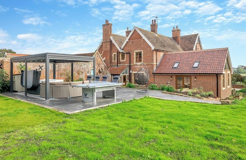 Bedroom 7: Zip And Link Super Kingsize (6ft) Bed, Smart TV, Sky, Netflix Ensuite: Walk-In Shower, Heated Towel Rail, Toilet. Biomass central heating, electricity, bed linen, towels and Wi-Fi included. Initial fuel for wood burner included. 2 travel cots and 1 highchairs. Welcome pack. Large enclosed garden with sitting-out area, terrace, garden furniture, table tennis table, barbecue, pizza oven and firepit. Hot tub for 7 (private). Bike store. Private parking for 7 cars. No smoking. Please note: There is a fenced pond in the grounds. This property has a security deposit of £500.. Neighbouring to a working arable farm, The Dukes Lodge has origins dating back to the 13th Century and was formally owned by the Duke of Norfolk. Transformed into a superb spacious park farmhouse offering the perfect venue for larger family get togethers, special occasions and surprise celebrations. Set in private grounds with large mature lawned gardens boasting three wonderful seating terraces having private hot tub, and outdoor barbeque area and wood fired pizza area, perfect to enjoy al fresco dining. The Dukes Lodge is nestled alongside a working arable farm, and offers guests exclusive private use to miles of foot trails located on the farm. During the day, the large windows flood the house with plenty of daylight and great views of the gardens.
