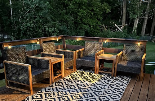 The deck has a dining table for eight and casual seating for four. A gas grill, propane tank and some grilling essentials are provided for those nights you want to stay inl. An evening on the deck can be enhanced by the solar lights and tiki lamps. There is a fire pit for use with lawn chairs located in the garage - we do not however provide firewood. The side yard immediately off the deck is a grassy area to hang out and play with the yard games we provide, located in the garage.