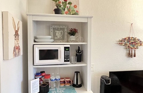 The unit includes high quality plush queen size bed, refrigerator, coffee corner with coffee\tea products, a kettle and a microwave (no full kitchen), AC, 40" cable TV, Hairdryer, Iron and all you need for a comfortable and relaxing stay.