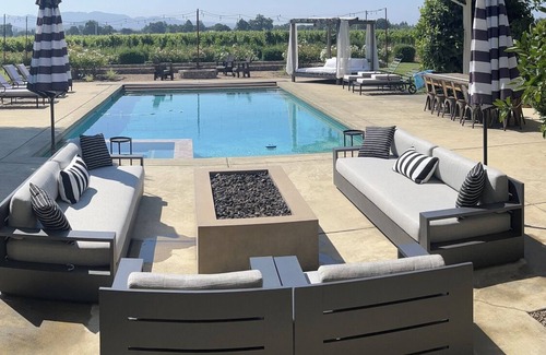 The house is a modern ranch style home situated on 1 acre with a private gated entry. There is a sparkling pool and hot tub, a wrap around porch, 2 outdoor fire pits, bocce ball court, and plush landscaping! A cozy cabana bed, lounge chairs for all, rocking chairs surrounding the fire pit, and outdoor couches offer comfort and variety for all of your backyard fun! With spectacular mountain views, surrounded by vineyards, it’s easy to not want to leave!