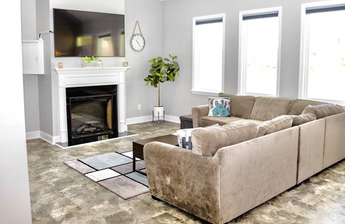Spacious living room includes a comfy sectional sofa for additional sleeping accommodations, cozy electric fireplace, laundry area, a gym in the loft including free weights and a pull-up/dips bar, backyard with seating and yard games, onsite parking, free high-speed WiFi, and keyless access.