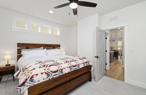 This beautiful double-story home, located in Boise, Idaho, is perfect for any traveler. It features three bedrooms and three full baths, including a master bedroom on the main level and a 2nd master bedroom on the upper level with a third bedroom and private bathroom. All rooms have access to private baths and TVs. This home was newly built in Nov 2022, with high end finishes.