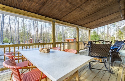 There is a patio area with a picnic table, propane grill, Firepit and umbrella. Right next to the patio there is a small building that is open on one side where the hot tub is located. Inside that building there is a small outdoor bar area!