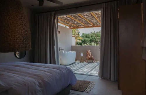 Spaces that are open and designed to complement the nature of the place. The Penthouse Villa Cocotera has a room with a king bed with a private terrace with a bathtub, hammock and unforgettable views of the orchards. In addition to a full bathroom and a top roof with benches and a table to enjoy the impressive sunsets, a good practice of sunrise yoga, or a glass of wine under the starry sky.