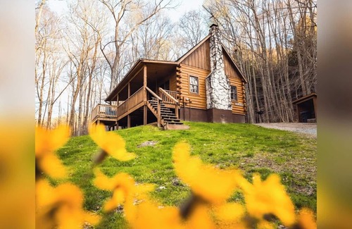Secluded log home - perfect for a romantic weekend getaway! Vaulted ceilings with exposed beams wrapped in Edison lights and furnished with rustic wood. Hot tub, fire pit, wood-burning fire place, porch swing, satelite tv and dvd player. Sleeps four, in two queen beds with two full baths. Well-equipped kitchen. Pet friendly (2 pet limit with $50+tax pet fee).