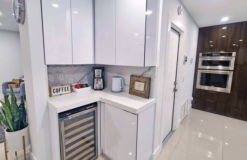 Fully-equipped with stainless steel appliances, wine fridge, and dine-in island