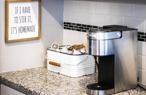 The dining room offers seating for six and doubles as your personal coffee haven. Enjoy a complete coffee bar with a Keurig, drip coffee maker, French press, and pour-over setup. Coffee grounds, creamer, and sugar are included with every stay. Ready to swap your coffee mug for a cocktail glass? You’re covered with a stylish mixer set ready for your favorite beverages.