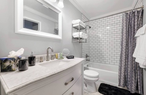 In addition to the four comfortable bedrooms, the home also has two full bathrooms. One is located off the primary suite, and the other sits on the lower level. Both have been recently renovated and feature tiled shower/tub combos. Each bathroom is stocked with plush towels and a starter supply of essential toiletries for your convenience.