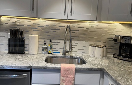 Up the stairs and you come to the living room, where theres a couch in front of a fireplace for you and your family to relax. Above the fireplace is a 75" flatscreen smart tv also with Netflix. The living area shares the space with the kitchen and dining area which seats 8-10 people The kitchen is fully stocked with everything you need, stove, microwave, coffee machine. Continuing past the dining area, you come out the sliding glass doors into a sun room that has comfortable seating for 6 and an outdoor deck with gas grill, charcoal grill, and outdoor patio seating for 6. Also attached to the living room is a 3rd bedroom with a queen bed, and the second full bathroom.