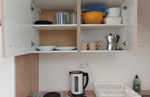 The kitchenette is equipped with cookware. Bathroom amenities include towels, toilet paper, and soap. Other amenities at this 1-bedroom, 1-bathroom rental include bed sheets and heating.