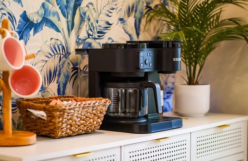 -Coffee bar with a dual coffee maker (ground coffee provided, but please bring your own K-cups) plus creamer and sugar