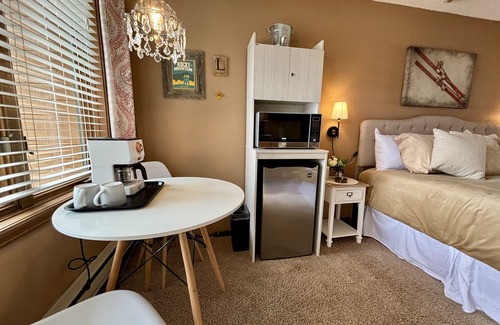 Our King Suite is 250 sq. ft. built in 1982. We have a King Bed, Dining for two, Microwave, Coffee Maker, Mini Fridge, Full size bathroom with double sinks and a small patio for two.