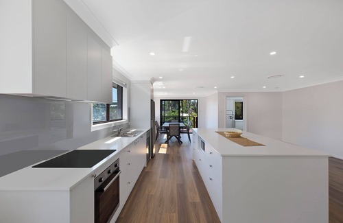 The house offers indoor and outdoor living on both levels, as well as modern accommodation for up to 13 guests. The home features 6 bedrooms and 4 bathrooms with an open plan kitchen and dining, ans indoor/outdoor casual living zone and lounge areas on both levels.