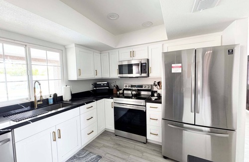 This two-story home sits on a corner lot in a quiet neighborhood, offering added privacy. It was newly remodeled and professionally decorated with a modern theme. Here is what to expect in each of the spaces: