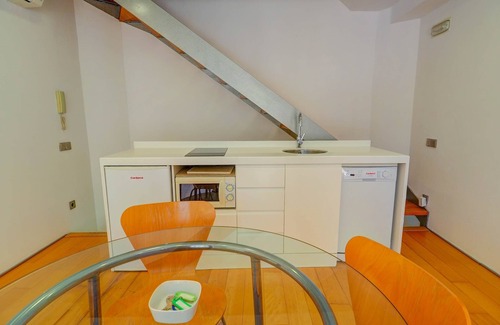 Upon entering the apartment, we find a staircase that leads us to the first floor where the kitchen and living room are located. The kitchen is open to the living room and is equipped with a coffee maker, electric kettle, microwave, dishwasher and a small refrigerator. Simple meals can be prepared.