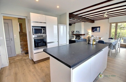 GR.FL : Entrance hall. Fitted kitchen. Lounge-diner. Bedroom 1: king-size bed. Shower room. WC. UPSTAIRS: Bedroom 2: twin beds. Bedroom 3: twin beds. Bedroom 4: double bed. Bathroom. WC. Internet access. Basement: 2 garages, one with table tennis table. Large L-shaped patio with wonderful sea views, small lawned area. Baby equipment : travel cot, high chair, bath, changing mat, booster seat and fireguard. End-of-stay- cleaning available. Local tourist tax payable directly to the owner. A spacious, Neo-Breton style house with large patio areas and panoramic sea views, great for a holiday with family or friends and for exploring the area between the Pink Granite Coast and the Côte du Trégor. Port l'Epine beach is 200m away and the wild, unspoilt peninsula of Port l’Epine is nearby.