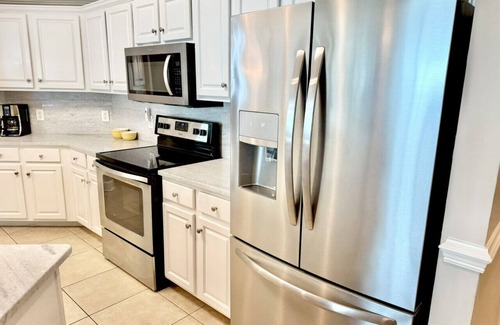 The kitchen is fully stocked for all your cooking needs. A large stainless steel fridge has plenty of storage for food and drinks, and the freezer is large enough to stay stocked up on what you need to stay cold. An ice maker is located in the freezer, and there is a spot to get water and ice directly on the large French style doors of the fridge. Stainless steel microwave, dishwasher, and oven with a glass stovetop allow you to get your chef on. A regular drip coffee machine is available for you to use. I attempt to keep disposable filters in stock for you to use. You will need to bring your own coffee. Also available for your use is a toaster, blender, can opener, pots and pans galore, baking sheets, and a full set of utensils and drinkware.