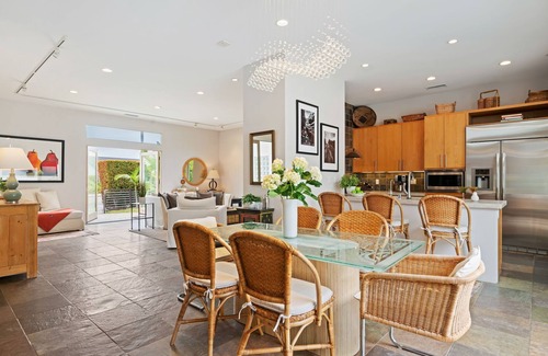 At the heart of the home is the great room where amplified ceilings, clean lines, textures and vibrant tones meet the sunshine. Sliding glass doors dissolve the boundary between indoors and out, framing views of the terrace and pool. There are two separate living spaces in which to relax and connect, one more formal area, the other with a television, and each offering the invitation to get cozy and comfortable. Some part of every day will involve hanging outside by the pool, simply slide open the glass doors to bring the outside, in. Whether lounging in the sun, soaking in the hot tub, or dining under stately palm trees that cast shade upon the poolside scene, the terrace delivers a signature California vibe.