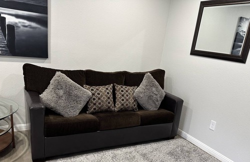 A very private home in a safe neighborhood with many amenities which include ; restroom with soap, body wash, shampoo/conditioner, a kitchen and dining table with kitchen utensils, a coffee maker, rice maker, blender, air fryer, pots/pans, bowls, living room with reclining sofa bed, 45in smart television, 2 bedrooms with 40in smart televisions, baby crib in 1 bedroom, wifi inside the home