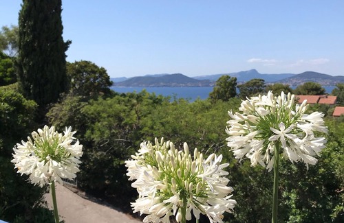 Villa located on the peninsula of Giens, 100 m from the sea, overlooking the bay of Almanarre, it offers a beautiful view of the sea and the mountains around Toulon. In a very quiet environment without being isolated, in the last line on the hill, close from the coastal path accessible by a gate, you will reach dream creeks which are 10 minutes walk. The large sandy beach of Almanarre is 5 minutes by car, the village of Giens 15 minutes walk (by road).