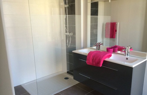 On the first floor, 4 bedrooms with view on the front or rear garden. All bedrooms have king size hotel-type bedding 180x200m, dressing room and direct access to a bathroom shared with another bedroom. The two bathrooms have a double vanity unit with mirror, shower with extra flat 90cm x 120cm shower tray, wall-hung toilet and heated towel rail. The two large bedrooms can have an additional 90cm bed that can accommodate one person.