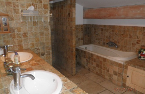 Upstairs, a bedroom with 2 beds (140cm bed) and its private bathroom (sink, bathtub and toilet) and air conditioning and another bedroom with 2 beds (180cm bed) with its private bathroom (2 sinks, Italian shower, bath and toilet) and its air conditioning as well as another small attic and air-conditioned bedroom with 2 beds (140cm bed).