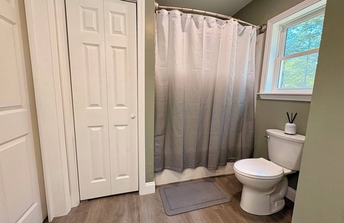 a/c and supplemental heating, automatic standby generator( so you will never be without heat or electricity, private boiler with radiant heat, on demand hot water, large pantry, remote operated fans and lights in bedrooms, blackout blinds, full bath with tub, full size washer and dryer. Large closets in each bedroom. Quiet wooded area. There are often deer passing by in the morning.