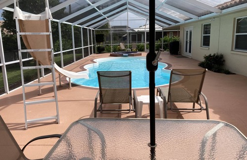 The home has two bethrooms that can sleep a total of 5 people with one full bathroom. Full kitchen, dining room, living room, garage with space for one car, lanai area, large pool with its own slide and Jacuzzi. The pool has an electric heat pump.