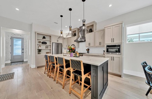 Upon entering, the home's exposed brick foyer immediately captivates with its soaring ceiling. Beyond the entrance and a convenient first-floor powder room, you'll find yourself in the spacious kitchen and dining area. Fully equipped with top-of-the-line fixtures and appliances, the kitchen boasts a stainless steel fridge/freezer, a five-burner gas range, dishwasher, microwave, coffee maker, oven, toaster, and blender. The home is stocked with an array of cookware, bakeware, and crockery, including separate sets for both adults and children. The generously sized kitchen island provides seating for four, while the primary dining area accommodates an additional eight guests. The living room offers ample seating, including couches and chairs, complemented by a large smart TV for streaming your favorite shows.