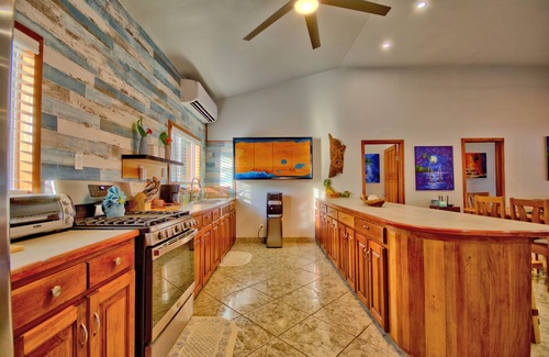 Find your Sol in Belize in our newly redesigned 4bedroom/4bath home that sits on over 450' of private beach and overlooks the Belize Barrier Reef that is a mere 800 meters offshore. Located 8.5 miles north of San Pedro town you'll enjoy that private island feel but have easy access to nearby restaurants, bars and grocery. This well appointed home is made up of beautiful décor to include custom artwork by Belizean artist Leo Vasquez and custom made Belizean hardwood furniture designed and built by Fernando Polanco. Rental includes use of our complimentary kayaks, SUP's, snorkeling and fishing gear. Life jackets are also available.