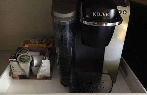 Comes nicely equipped with a Keurig coffee maker, microwave, toaster and small refrigerator. NO FULL KITCHEN. Firepit is available in cooler months.