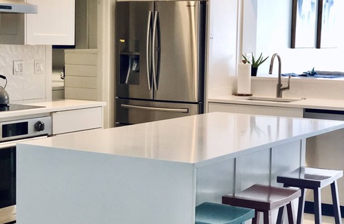 The 4 bedroom, 2 bath home is thoughtfully renovated with tile floors throughout; an immaculate, white custom kitchen with quartzite countertops and Bosch appliances; contemporary furnishings in an open floor plan; and bright, comfortable bedrooms. New central AC keeps the air cool and conditioned.