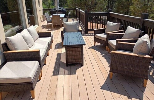 Encompassing 3,100 square feet of tastefully decorated space, Cedar Ridge offers four bedrooms and 4.5 bathrooms, effortlessly hosting up to 14 guests with the addition of three pullout couches. Each bedroom is adorned with a private en-suite bathroom for enhanced convenience, while the master suite elevates comfort with a spacious walk-in shower and a soothing whirlpool tub.