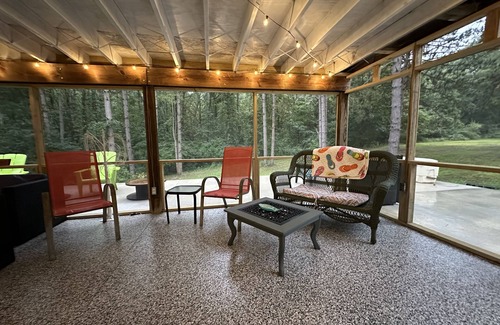 A private suite in the lower level of our log cabin home, featuring a separate entrance, full bedroom, living room, kitchenette, bathroom with shower, and indoor/outdoor family space sits on twelve acres of wooded land just ten miles outside of Notre Dame, IN.