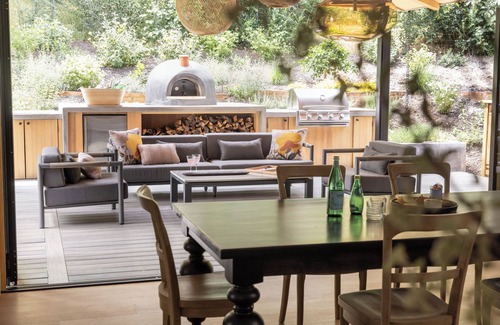 OUTDOOR SPACE Seamlessly blend indoor and outdoor living as floor-to-ceiling bifold glass doors open onto a sun-drenched wrap-around deck. Host unforgettable gatherings with a dining set for 10, a massive outdoor kitchen island, and a built-in gas grill under a vaulted redwood veranda. After a day of wine tasting, relax on the private patio in the six-person cedar sauna, unwind in the hot tub, or enjoy evenings by the dazzling stone fire pit.