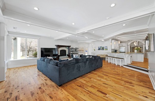 Plan your family getaway at this 14,000 sf luxury home tucked away in the woods on a secluded 5 acres in McDonald TN. All your entertainment needs are met with an outdoor heated salt water pool, hot tub, giant tiki bar, volleyball court, tons of patio seating, fire pit, and interior game room. Relax in our fully equipped kitchen, dining room, multiple oversized master bedroom suites with jacuzzi tubs, and brand new furniture and mattresses throughout. Office space with WiFi and home gym is available during your stay.