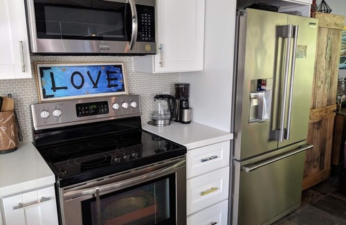 Corazon features an open floor plan with an island kitchen w/ various cookware & appliances. Cook in over/on stove, Vitamix, dehydrator, waffle & panini maker, kitchen-aide mixer, Cuisinart etc. Enjoy the NINJA coffee maker, coffee grounder, dishwasher, filtered water and ice from fridge/freezer. We also leave out various coffee fixings, condiments, rice, pasta, spices, cooking oils & spray for your convenience. We request that meat be cooked outside conveniently on a our outdoor Chef's Style Stainless Tabletop Grill. Full disclosure, our indoor vent system and house cannot handle cooking meat AT ALL.
