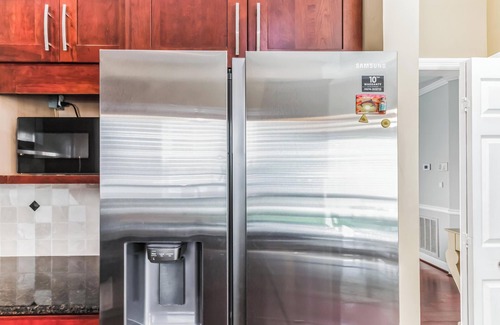 The front entrance lives into a foyer with the stairs to the upper floor and a hallway leading to the living area. The living room has a queen pull out couch and 50" RokuTV. Off the living room is an eat-in fully stocked kitchen with a separate dining area that can seat 8, along with a half bathroom. Upstairs are four bedrooms, one with a king bed with ensuite full bathroom with garden tub and shower and walk-in closet, three queen bedrooms, and another full bathroom with tub. Note: two bedrooms are connected, and you have to walk through one of the queen bedrooms to get to the second. The backyard boasts a, pool, seating, and grill.