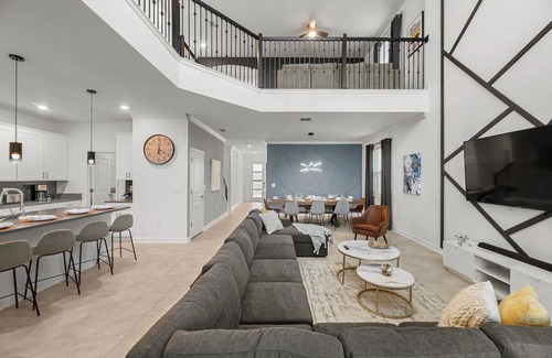 Picture yourself lounging in the open-plan living room, sinking into the plush sectional sofa and armchair after an exhilarating day at the nearby theme parks. The 75” smart TV and crystal-clear soundbar promise unparalleled entertainment, creating a haven for cherished family moments.