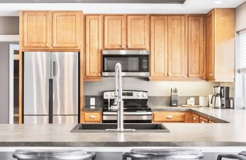 Recently upgraded and beautifully furnished throughout, this spacious and private three-bedroom home features an open floor plan with a modern kitchen, counter-height seating, and a living room with 50” Smart TV.
