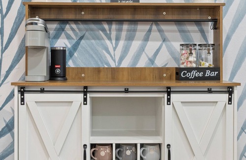 Our kitchen has everything you need. Refrigerator, Stove, Oven, Microwave, Dishwasher, Toaster, Pots & Pans, Plates, bowls, & Utensils, Knife set, Spatulas, and Cups. We even have a dedicated coffee bar with a Keurig coffee maker, coffee mugs, a frother, coffee mate creamer and sugar packets. Our bar is equipped with rocks glasses, tall glasses, wine glasses, electric wine opener, and bar utensils. Enjoy meals at the built-in breakfast bar that seats 4 and dining table that also seats 4, totaling 8 seats for the kitchen!