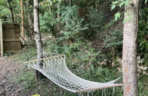 The yard is on the edge of the woods with privacy fence on the other 2 sides. Outside feels magical at night with lights hanging overhead, crickets chirping, and your favorite person by your side. Roast marshmallows over the fire pit, sit in glider rockers, or swing lazily in the one person hammock. I can’t hardly wait to see you enjoy it!