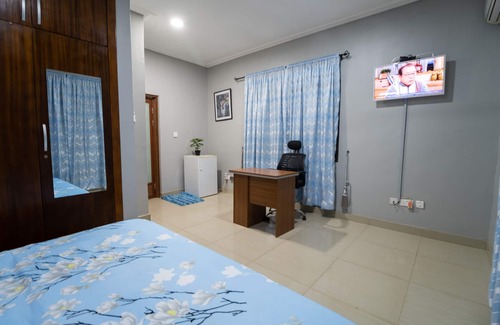 Welcome to the Topaz Room at JSM Court! This cozy blue room offers a serene hill view in Oyarifa. We provide all the essentials for a comfortable stay, including linen and toiletries. Plus, enjoy amenities like AC, WiFi, a dedicated workstation, backup generator, and hot water for your convenience. Our spacious kitchen is fully equipped for your cooking needs. Enjoy the clean environment and green outdoors. This room is a guest favorite for a reason!
