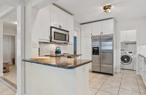 The kitchen is a chef's delight, featuring all high-end white cabinets, stainless steel appliances, and a beautiful granite countertop. It's fully equipped to meet all your culinary needs, and the adjacent entrance to the laundry room houses a brand new washer and dryer for your convenience.