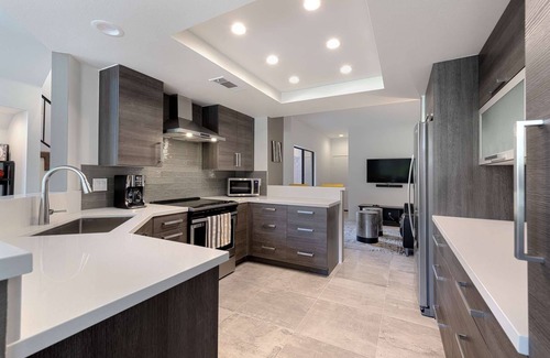 - Kitchen with all new appliances, counters, and cabinetry (Contemporary and Beautiful) Island and seating for 2
